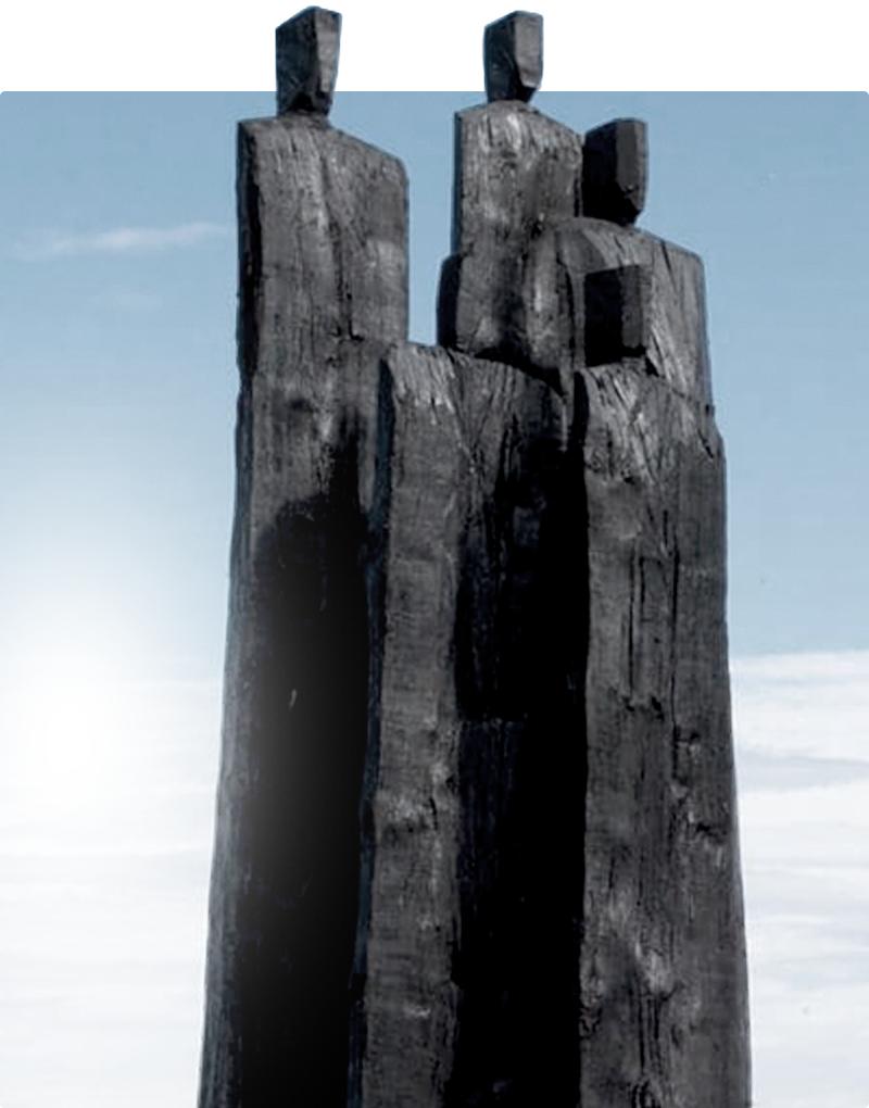 Lapie schafft ein Werk, das tief mit dem individuellen und kollektiven Gedächtnis verbunden ist. Seine dunklen, arm- und gesichtslosen Figuren erinnern an universelle menschliche Silhouetten – geisterhaft und zugleich beruhigend. Aus rohen Baumstämmen geschnitzt, die er bearbeitet und verkohlt, wirken sie wie zeitlose Wächter, die die Präsenz des Menschen in der Landschaft verkörpern. Indem er historisch bedeutsame Orte bewohnt, erforscht er mit seinen Skulpturen unser Verhältnis zu Zeit, Natur und der menschlichen Existenz und etabliert so eine Bildsprache, die ebenso einfach wie universell ist.