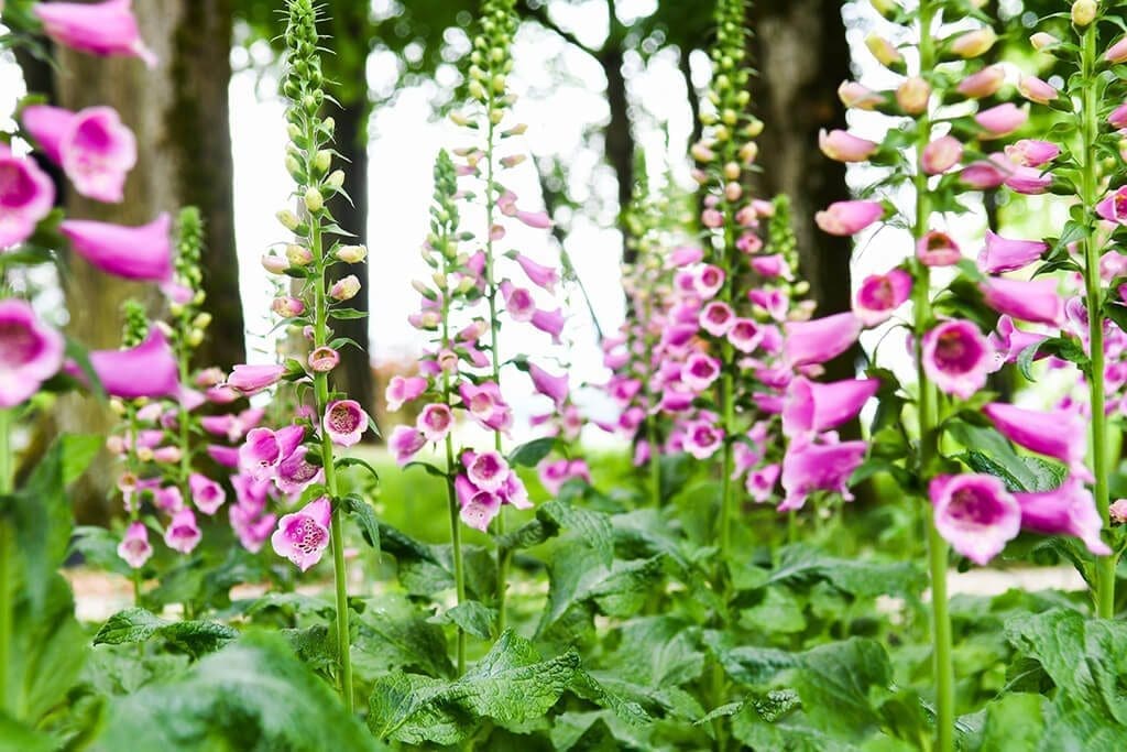 Rosa Hybrid-Geranien ‘Matu Vu’ setzen Akzente in den Beeten und erzeugen eine sanfte, harmonische Wirkung. Digitalis purpurea, der Fingerhut, bringt Struktur und leuchtende Farben ins Spiel und lockt Hummeln an, für die er ein wertvoller Helfer ist. Er teilt sich diesen Platz mit anderen Heilpflanzen wie dem Hand-Rheum (Rheum palmatum).