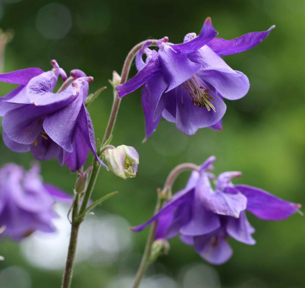 Die Saison beginnt mit der zarten Osterrose (Helleborus orientalis) in Farbtönen von tiefem Purpur bis zu einem rauchigen Rosa. Darauf folgen zwei Tränende Herzen (Dicentra spectabilis und spectabilis alba) mit weißen oder rosafarbenen, glockenförmigen Blüten. Funkien, bekannt für ihr dekoratives Laub, setzen mit ihren dezenten Blütenbüscheln weitere Akzente. Akeleien, auch „Feenblumen“ genannt, strecken im späten Frühling ihre eleganten Stängel in die Höhe. Kein schattiger Garten wäre vollständig ohne Farne: Hier nehmen Dryopteris filix-mas und Matteuccia struthiopteris (Schweißfarn), zwei der ältesten Pflanzenarten, einen Ehrenplatz ein. Entlang des Weges präsentiert das Immergrün (Vinca major) seine kräftigen blauen Blüten, begleitet von Pulmonaria angustifolia ‘Azuria’, deren rosa Knospen sich zu bläulichen Blüten öffnen. Einst zur Behandlung von Lungenkrankheiten eingesetzt, verdankt diese Pflanze ihren Namen ihren heilenden Eigenschaften.
