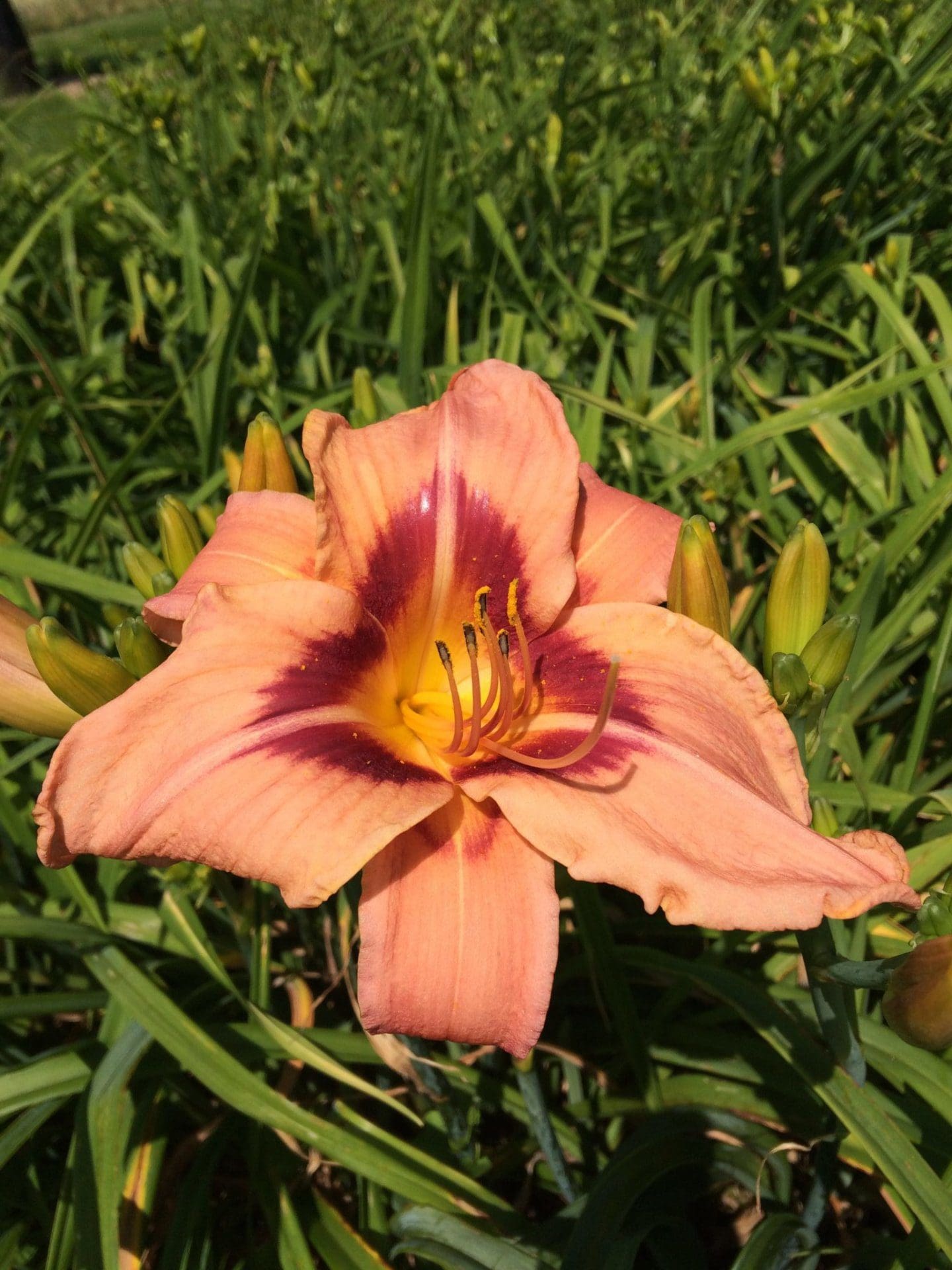 A gentle journey on peach petals punctuated by a deep burgundy eye. A charming, undulating stroll.